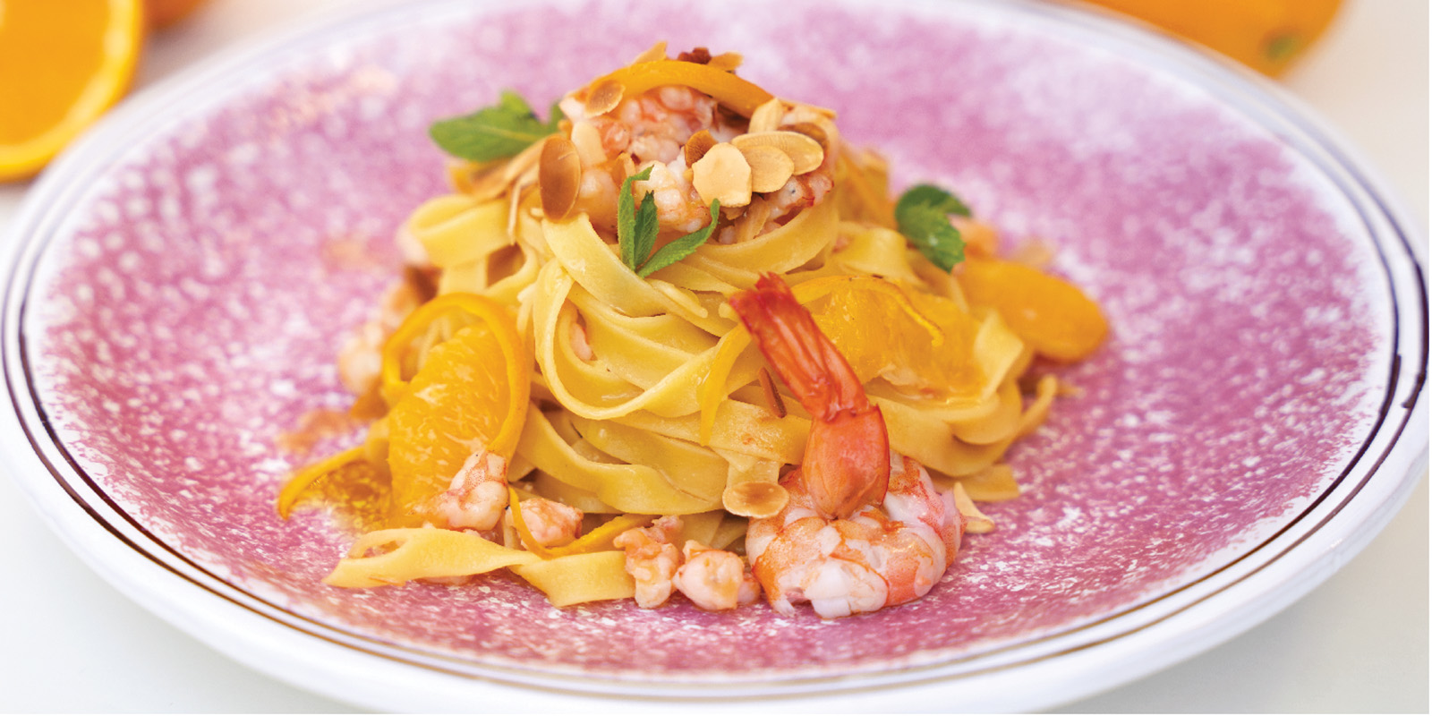 Tagliatelle Gamberi, Agrumi e Mandorle