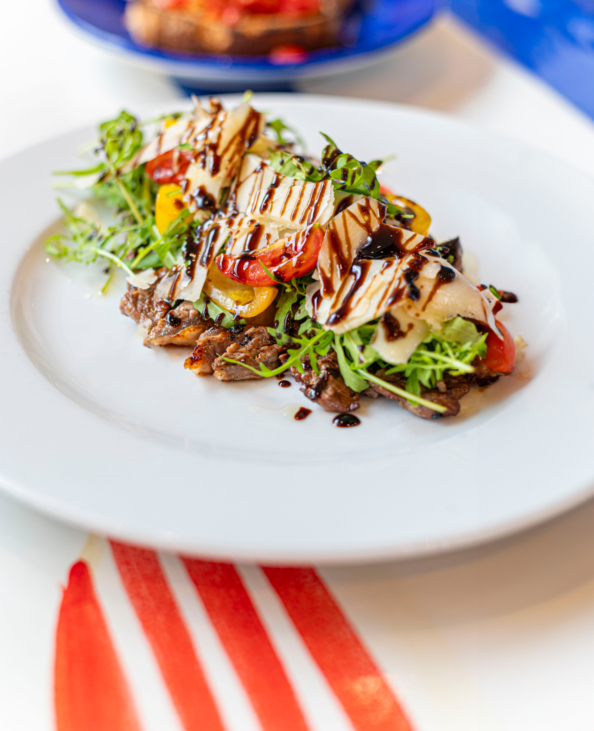 Tagliata di Manzo servita con rucola, pomodorini, scaglie di Grana Padano e glassa di aceto balsamico