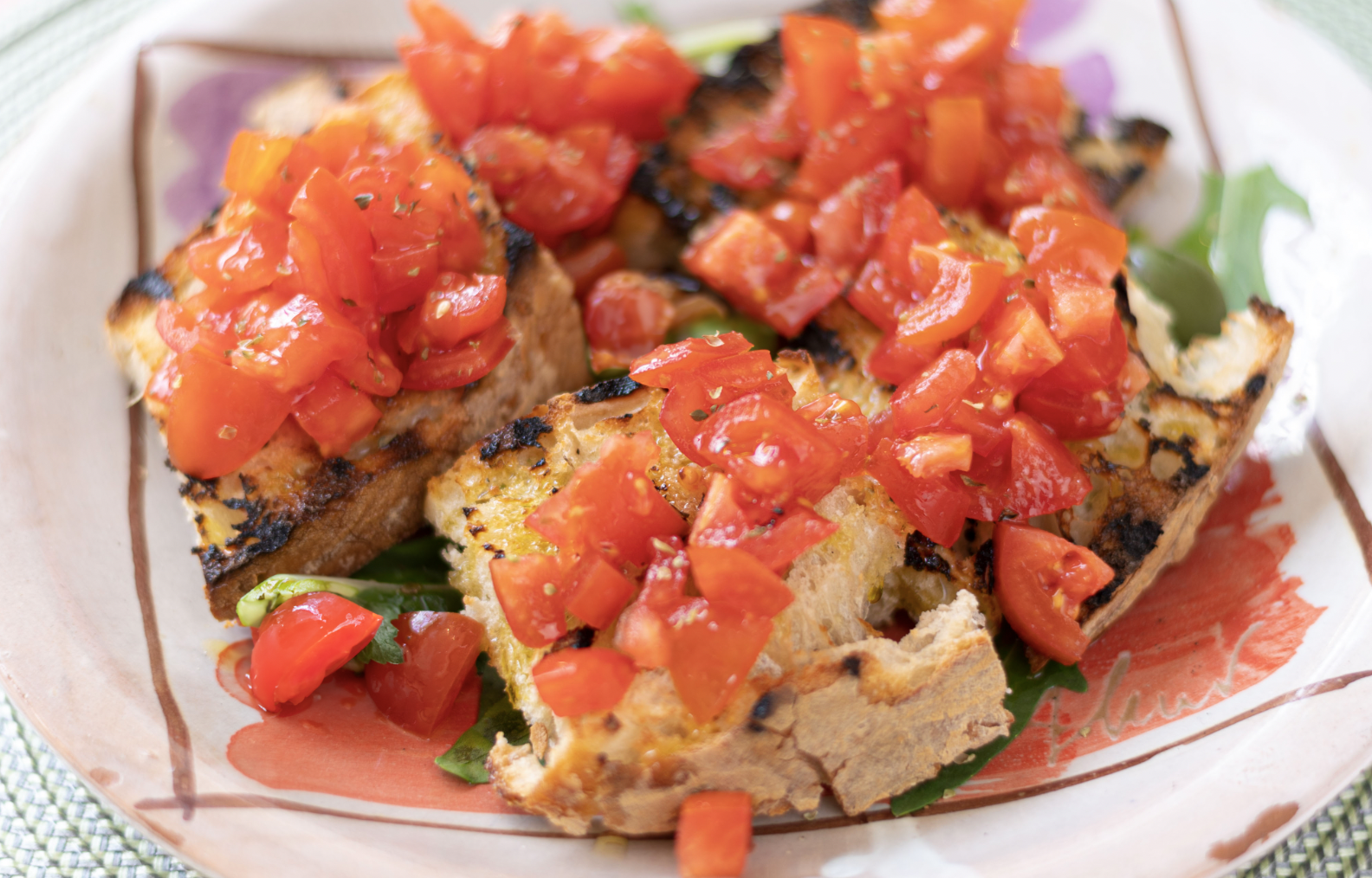 4 snee geroosterd zelfgemaakt brood met kerstomaatjes, knoflook extra vergine olijfolie en oregano