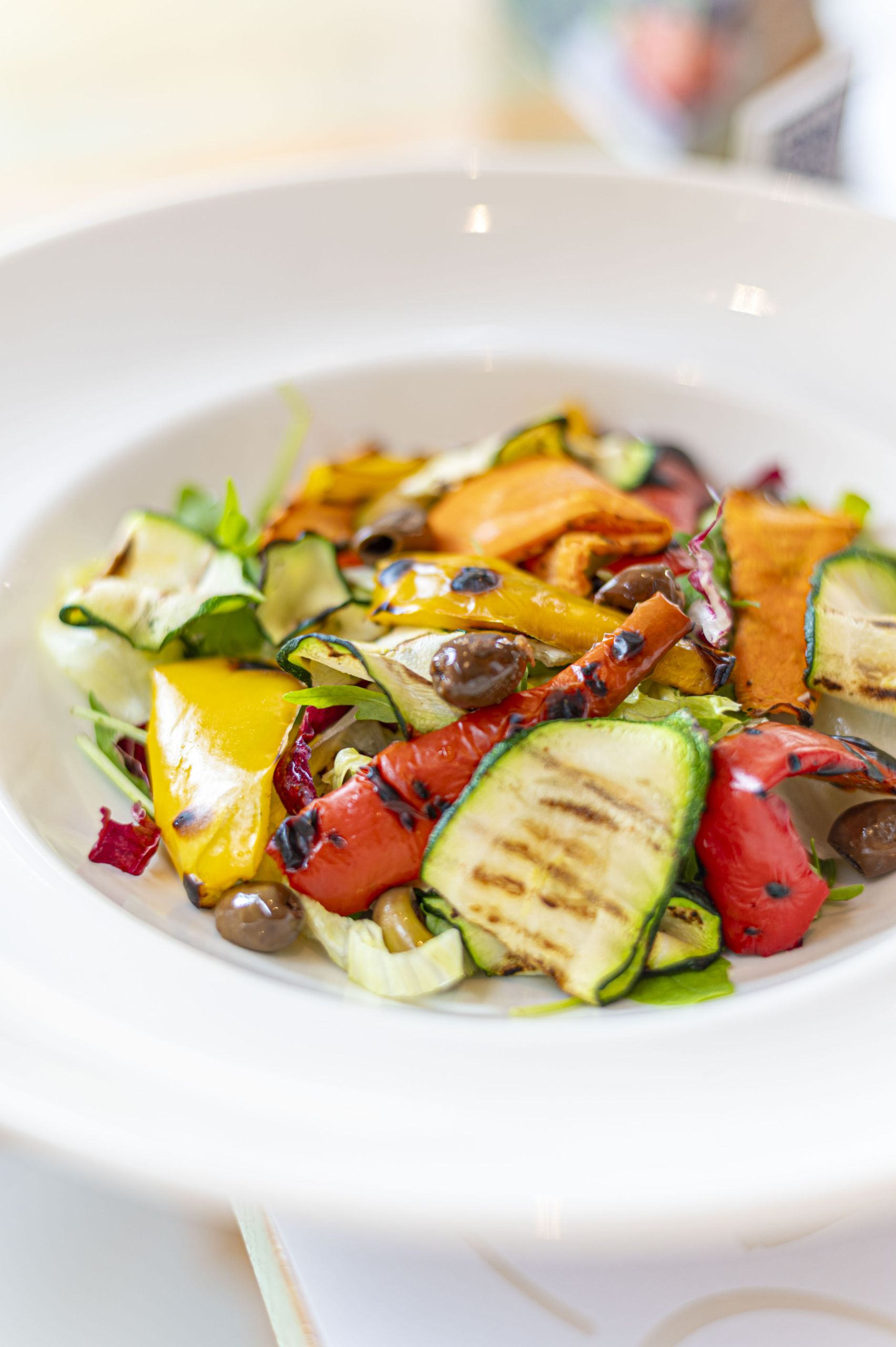 Gegrilde groenten (courgettes, paprika, wortels) met slamix en Taggiasca-olijven