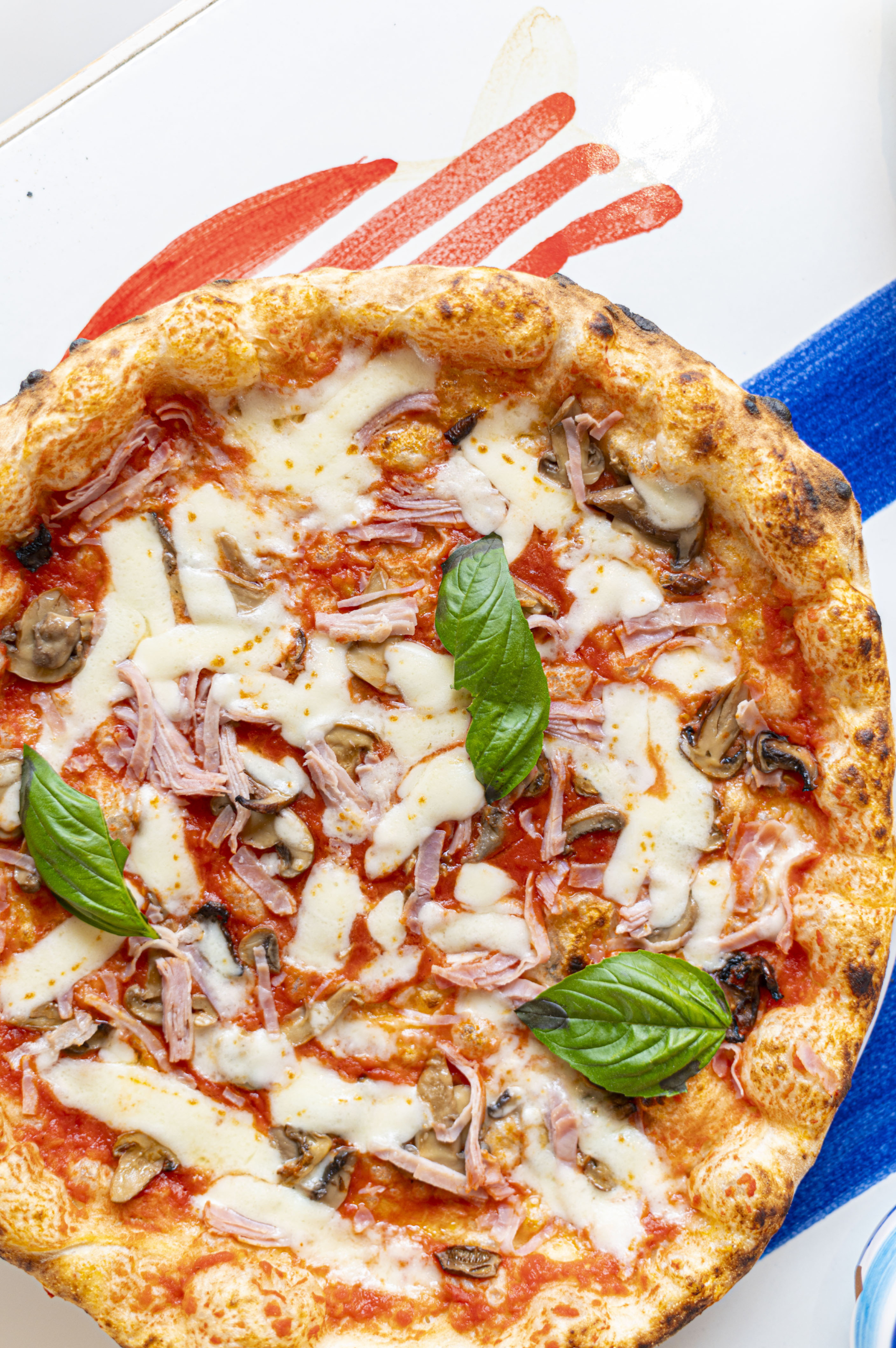 Gekookte ham, tomatensaus, champignons, artisjokken, salami Taggiasca-olijven, Grana Padano en fior di latte mozzarella