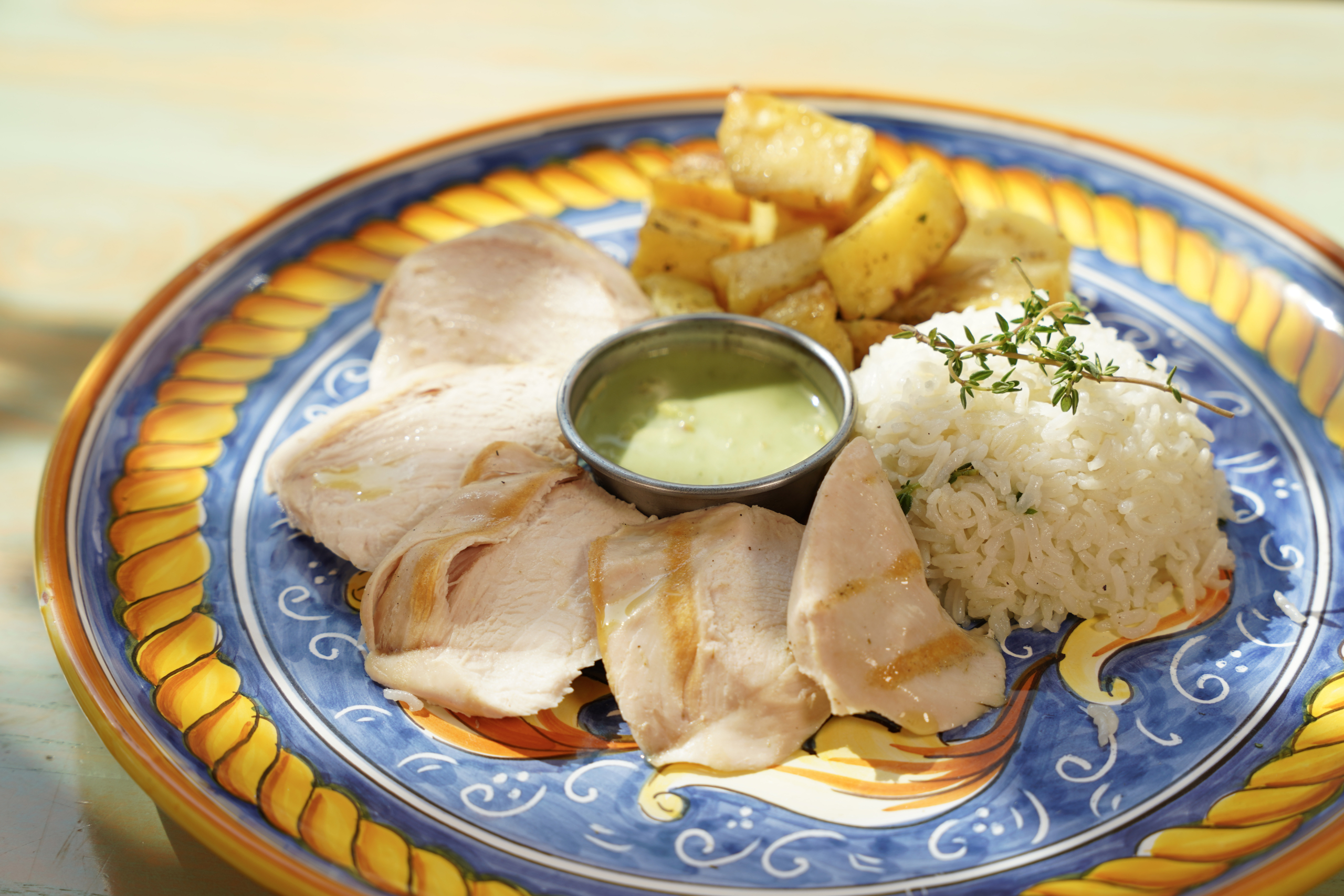 *Langzaam gegaarde kipfilet met citroensaus rijst met aromatische kruiden, spruitjes en gebakken aardappelen