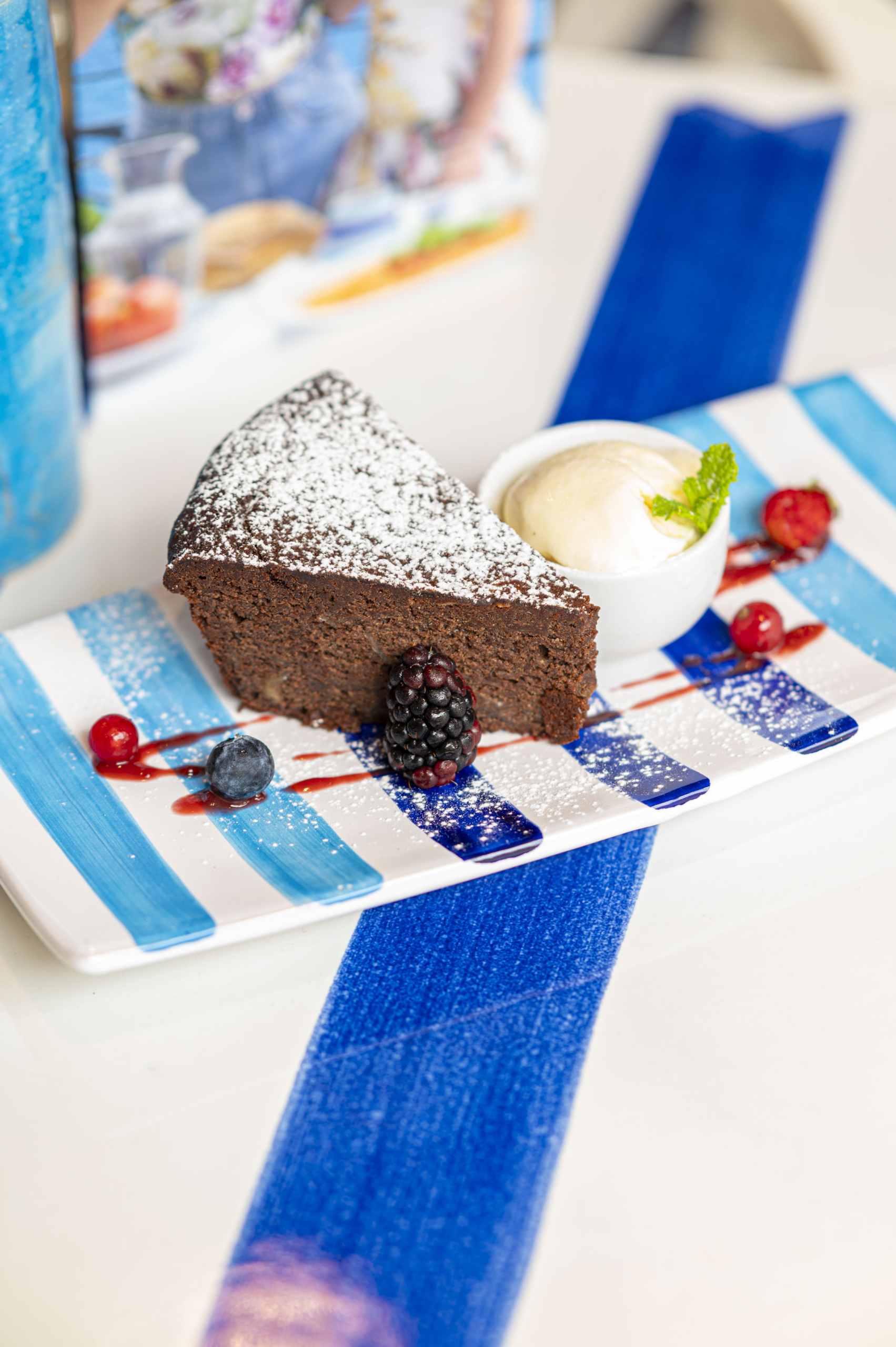 Traditioneel Napolitaans dessert met cacao en amandelen op een frambozencoulis en geklopte slagroom, geserveerd met vanille-ijs