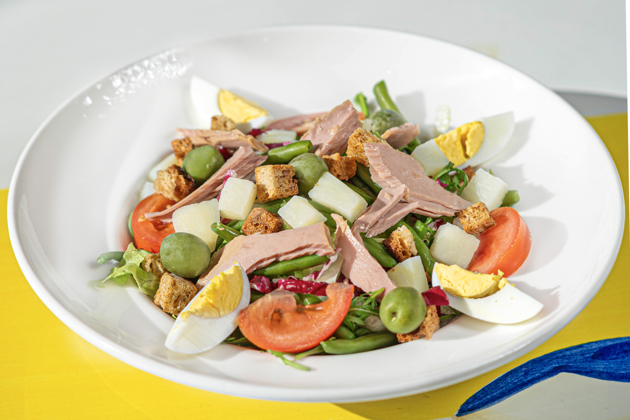 Tonijn, gegrilde primosalekaas, gemengde salade, gekookte aardappels, Taggiasca-olijven, sperzieboontjes en broodcrostini