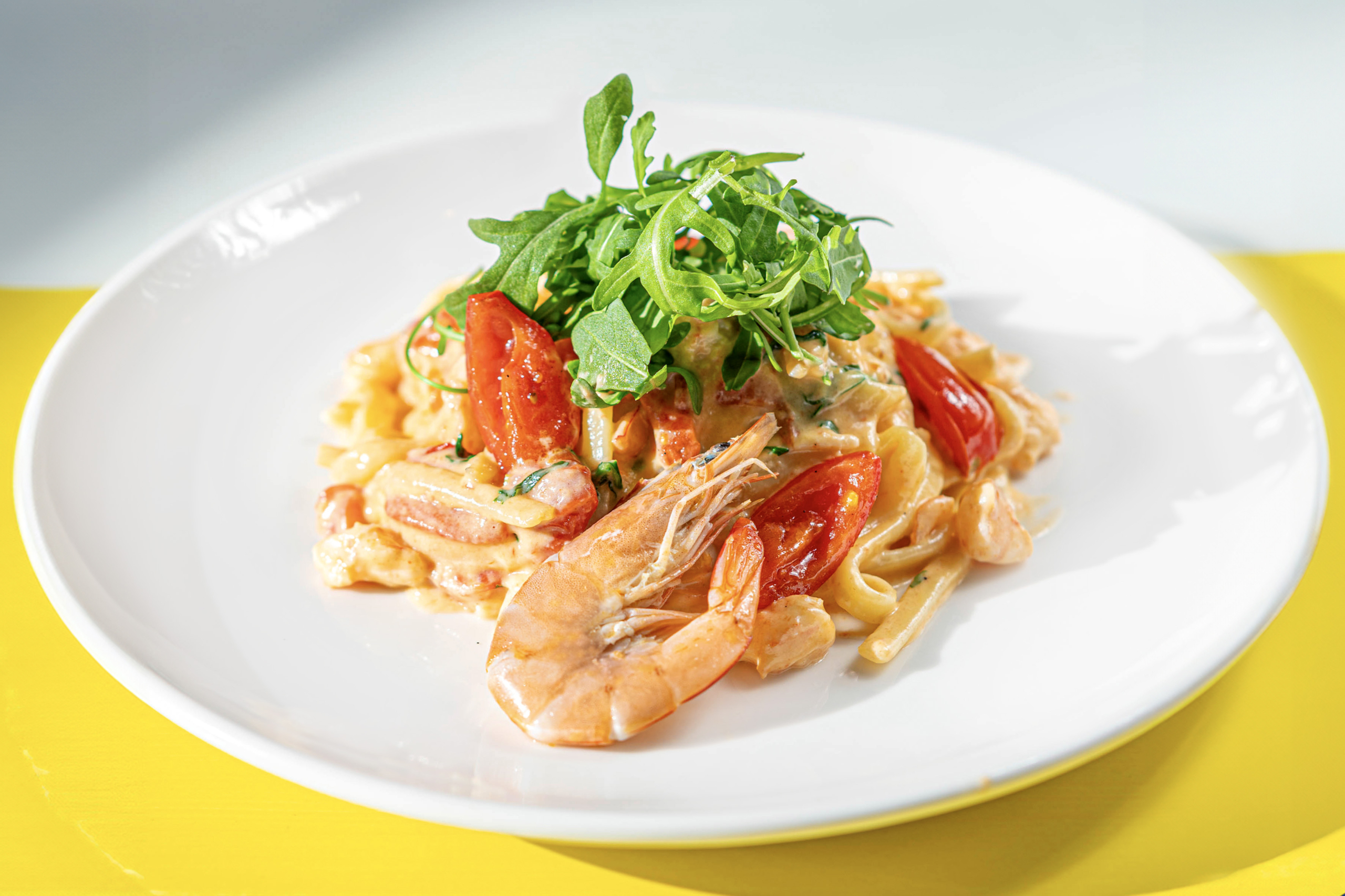Verse pasta met garnalen, kerstomaatjes, rucola en room