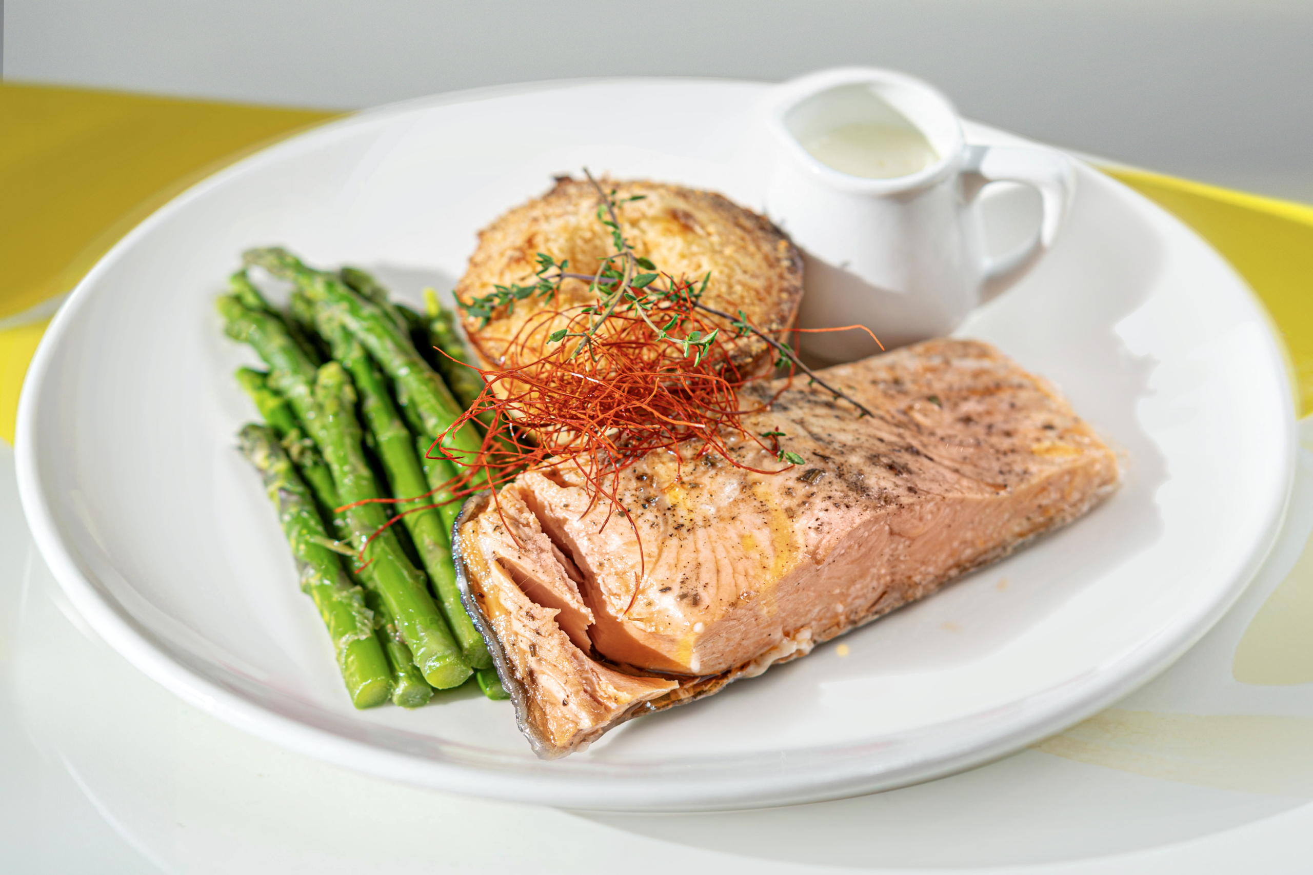 Zalmsteak op lage temperatuur gegaard, geserveerd met *Asperges met zwarte peper en *aardappelflan