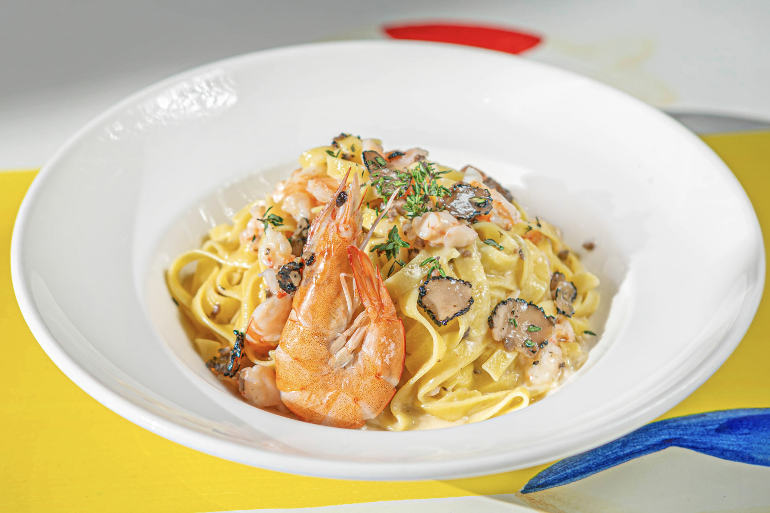 Tagliatelle, Normandische boter met zwarte truffel en *garnalen uit Mazara del Vallo